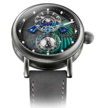 クロノスイスは、重力が物体を引き寄せる様子を文字盤の意匠によって表現した「スペースタイマー グラビティ」を発表した。波模様の広がりによって奥行き感を表現したギヨシェ彫り部には、クロノスイスが得意とするCVDコーティングを施し、フォレストグリーンからオーシャンブルーへと変化する鮮やかな色彩を実現している。さらにグレーの文字盤ベース部には、NASAのデータを元にした月面の様子を緻密に刻み、宇宙と、宇宙を支配する強大な重力を本作の中で表現している。